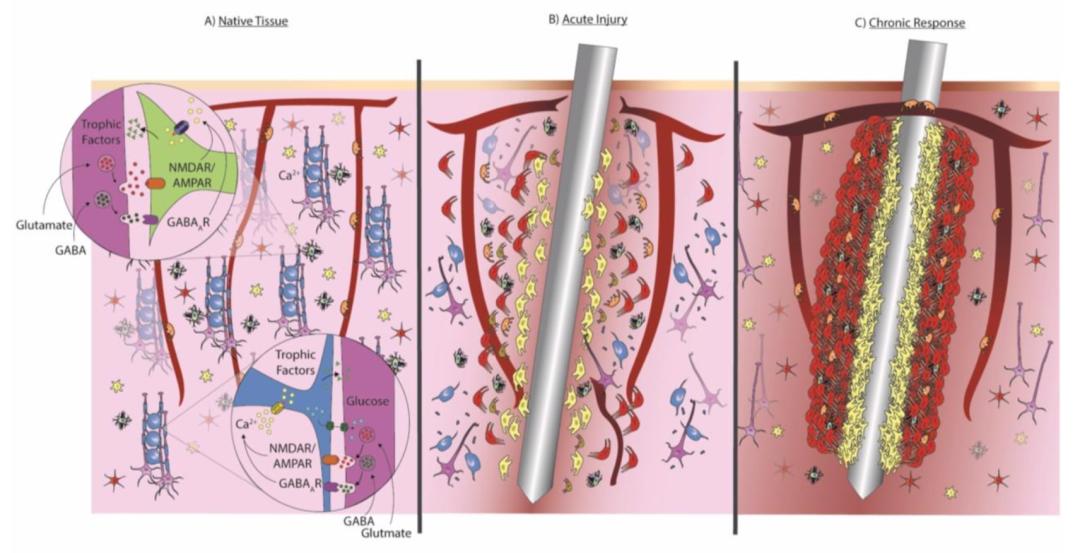 图:电极植入引发的脑胶质细胞结痂等炎症反应(中:急性损伤;右:慢性反应)。来源:ACS Chem. Neurosci. 2017, DOI: 10.1021/acschemneuro.7b00403
