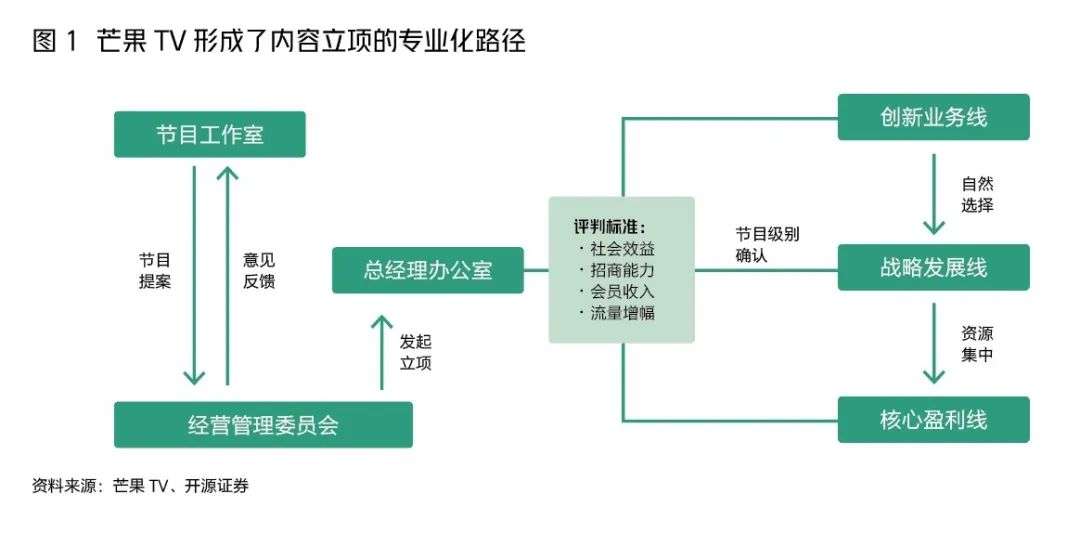 为了激活内容创新,芒果TV设计了一套考核制度,将项目结果量化,奖金与之挂钩。东吴证券分析师介绍,每个工作室的7名核心成员可分享全工作室70%的项目价值奖。工作室申报的项目在全公司公开,奖金的计算方式也在全公司公开,每个项目都很清楚自己做到什么程度能拿多少钱:干得好,一年就能买车买房;干得不好,就拿基本工资。若做砸了两个项目,工作室就要被淘汰,每年保持10%的中层干部淘汰比例,刺激人才新陈代谢。