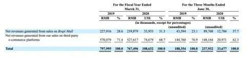 而在产品销售层面,波奇宠物对第三方电商平台的依赖度始终较高。根据招股书,2019财年及2020财年,波奇宠物自营的波奇商城产生的产品销售净收入占比分别为28.6%、31.3%,而第三方电商平台的产品销售净收入占比分别高达71.4%、68.7%。以此计算,2019财年及2020财年,来自于第三方平台的营收在波奇宠物整体营收中的占比分别为70.9%、68.6%。