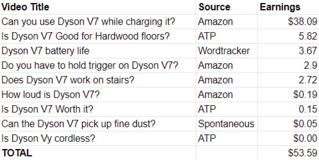从我那9个视频的收益结果可以清楚地显示出哪个网站平台是最好的:无疑就是亚马逊。在这9个视频中,我超过82%的收益都来自于观察戴森V7的亚马逊商品页面所产生的创意。这对其他创作者来说是一个有益的经验,如果你想创建自己的产品相关视频,不妨先从亚马逊开始。