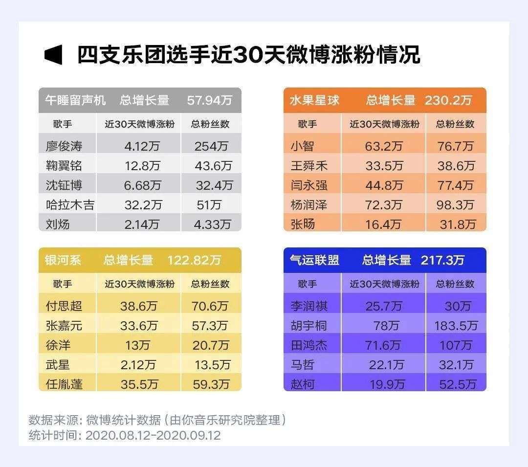 目前,已经成团4天的「气运联盟」微博已经有了9多万粉丝,陆续开始了商业活动。而【由你音乐研究院】整理发现,在决赛之前的一个月,四支乐团选手微博总体涨粉量迅猛,最高的乐团「水果星球」5位学员总增粉量达到230.2万。