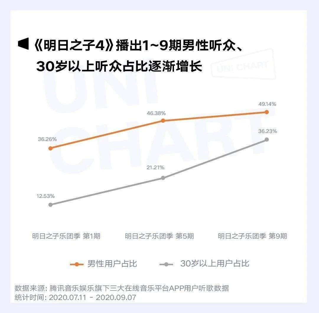 对比《明日之子乐团季》1-9期用户听歌数据时,【由你音乐研究院】发现,随着节目的播出,节目歌曲的男性听众占比逐渐提升,从36.26%增加至49.14%;而30岁以上熟龄听众占比也在提升,从12.53%增长至36.23%,几乎翻了三倍。