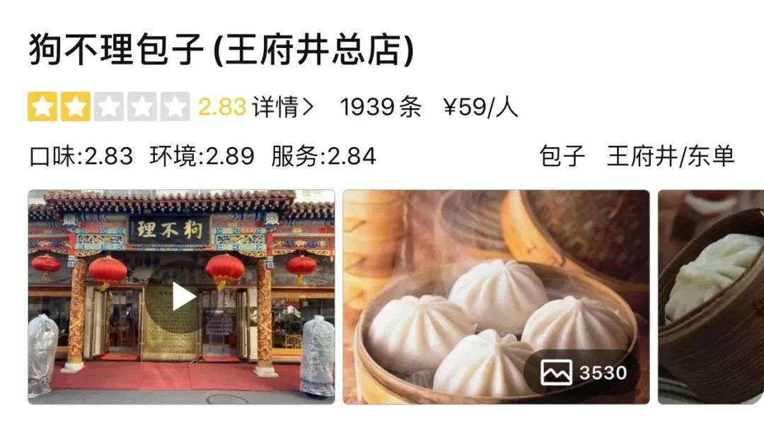 根据大众点评App显示的信息,狗不理包子(王府井总店)过去6个月的星级评分在2.84分—2.87分之间(满分为5分),在北京各类小吃快餐中星级分排行几乎倒数。