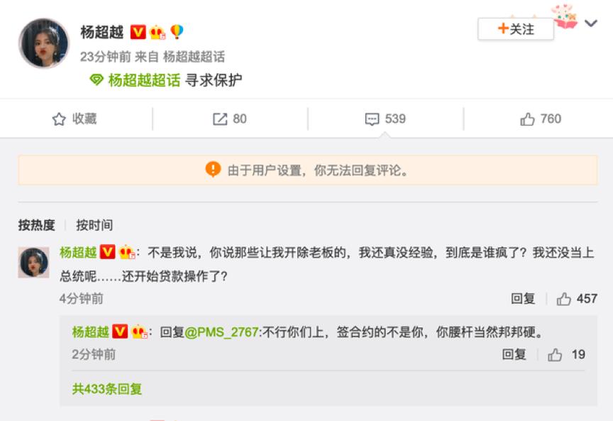 比如上个月,杨超越粉丝刷屏其微博留言,要求更换不专业的经纪团队,逼得杨超越本人下场回应:“开除老板,我还真没经验……贷款操作?”