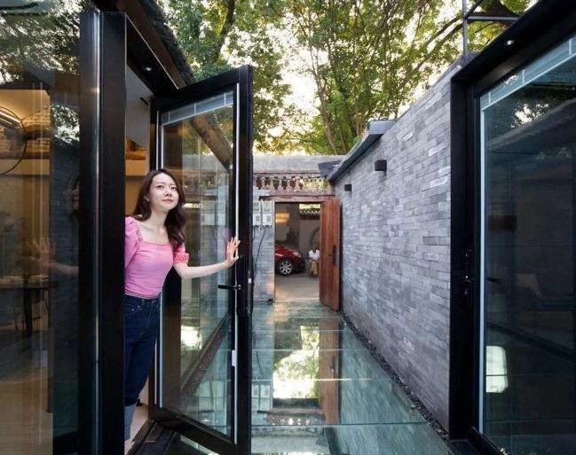 他们把老旧的墙面和地面打掉重做,地面上铺满了镜子,大面积的玻璃不仅改善了家里的采光,还将胡同的院墙、树影全带进家里。