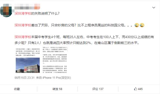与之相对的,深圳的教育却可能配不上它的房价。上个月,深圳中考成绩出炉,深圳湾中学考入四大名校的学生仅为7人,引发了周边业主的质疑。有业主调侃道:“买2000万的房,上排名倒数的学校。”