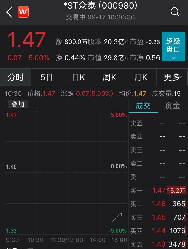 17日开盘后,截至发稿*ST众泰一字涨停,报1.47元/股,现总市值29.8亿元,不过其股价从年初至今已下跌49.83%。