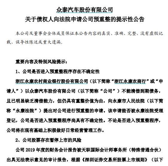 9月16日晚,*ST众泰发布《关于债权人向法院申请公司预重整的提示性公告》。
