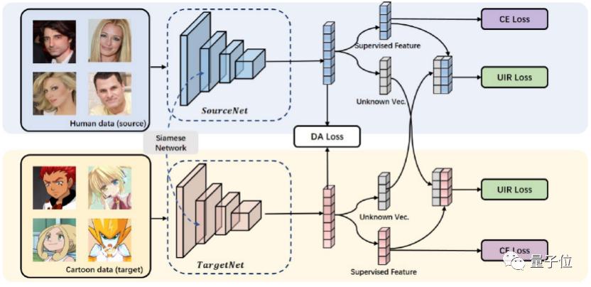 团队提出了一种卡通和真人的多人物训练框架,主要包括分类损失函数、未知身份拒绝损失函数和域迁移损失函数三部分,如下图所示。