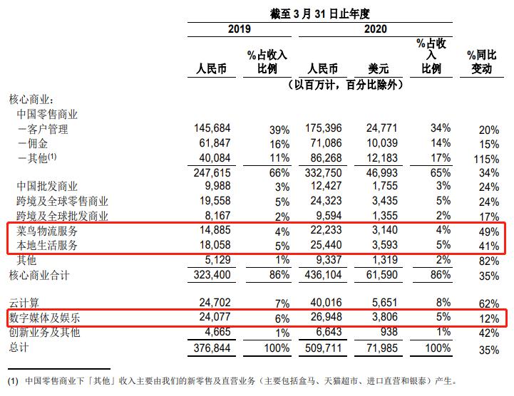 从2020财年阿里年报可见,本地生活、菜鸟物流、数字媒体及娱乐等业务板块的营收占比依然很小。