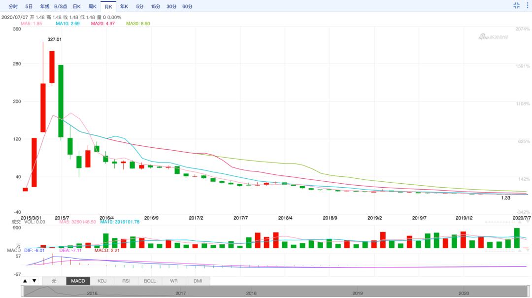 从7月7日就已暂停的股市走势图,最高时暴风集团股价曾达327.01元,如今停牌在1.48元