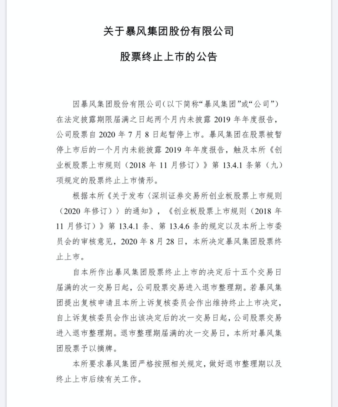 8月28日,深交所官网披露消息显示,由于暴风集团被暂停上市后的一个月内未能披露2019年年度报告,根据深交所《创业板股票上市规则(2018年11月修订)》第13.4.1条第(九)项的股票终止上市情形,深交所决定将暴风集团停止上市,并于9月21日进入退市整理期。