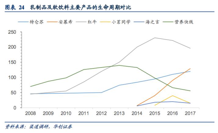 在常温奶领域,消费诉求主要是营养要好,产品迭代的速度反而是次要的。结果就是,安慕希、金典、特仑苏、莫斯利安等品种的产品生命周期非常长,可以达到10年以上,成了超级现金牛,也让伊利蒙牛光明有充足的时间建立起销售网络,不断巩固优势。
