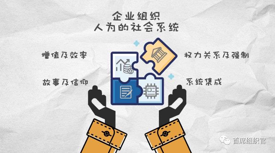 我会从四个角度去定义企业组织:政治角度(组织是权力关系及强制);经济角度(组织是增值及效率);社会角度(组织是个故事及信仰);工程角度(组织是个系统集成)。综合来说,我对“企业组织”的定义是:一个人为的社会系统。这个定义强调了组织的社会性、组织工程性(人为+系统),也涉及到了一点组织的政治性(人为)。这个框架没有特别强调组织的“经济性”,因为这是每个企业都不大容易忽略的。政治性(即权力及强制),在我们的文化环境下,也是不容易被忽视的。组织的社会性、工程性、政治性,都是人力资源人员可以深入学习研究的。而且这几个方面不太受企业所处行业的影响。