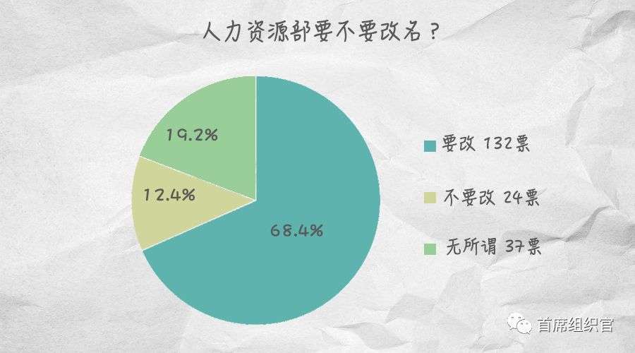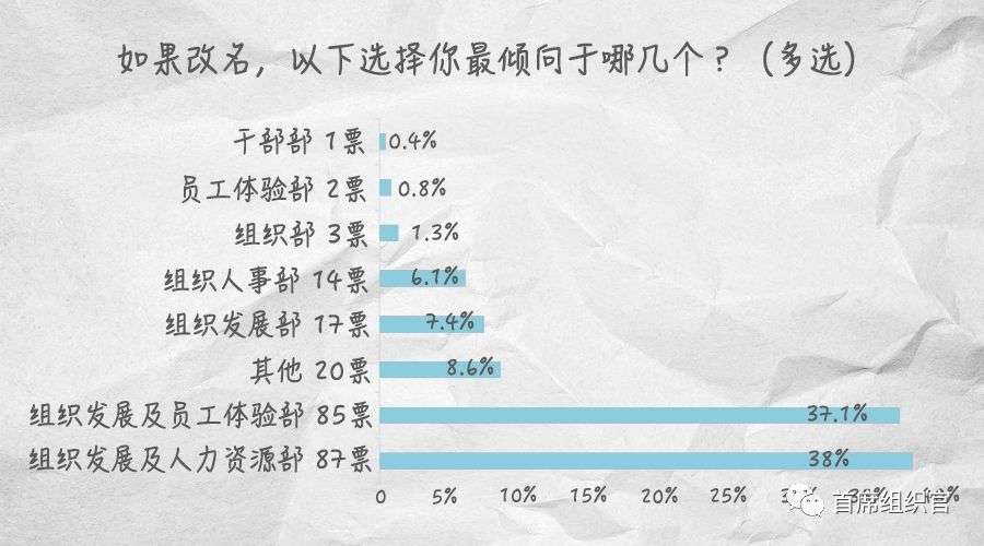 这个调查收集到的数据量本身虽不大,但从调查的结果来看,至少说明大家对于人力资源职能的现状是非常有危机感的。而且我们也可以看出,大家对于“组织”这件事的认可度非常高。(顺便说一下,令人高兴的是,没有几个人欣赏组织部、干部部这种过于政治化的名称)。