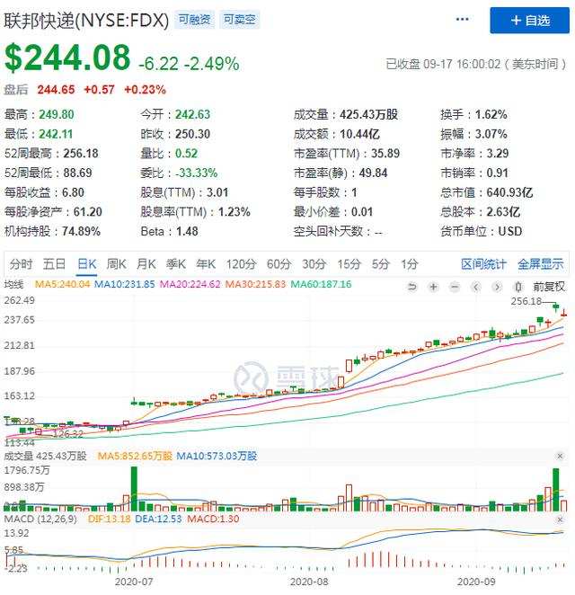 从整体数据上看,联邦快递较去年同季度的业绩表现不错,财报发布后公司盘后股价一度涨超7%。这样来看,大多投资者对这份财报同样持肯定的态度。截至发稿时,股价上涨0.23%至244.65,市值超过640亿美元。
