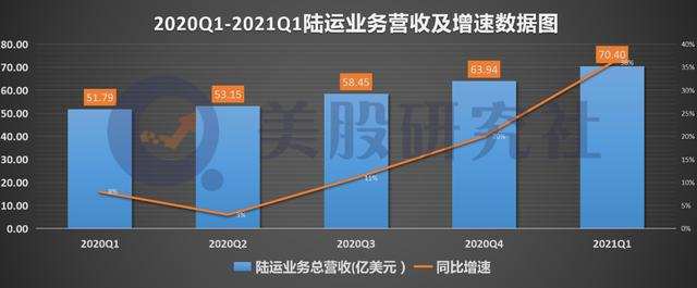 其中,联邦快递在北美地区的陆运业务表现十分亮眼。财报显示,公司本季度陆运业务录得营收70.4亿美元,同比增长36%。相较于上一季度的63.9亿美元提升了10.2%。