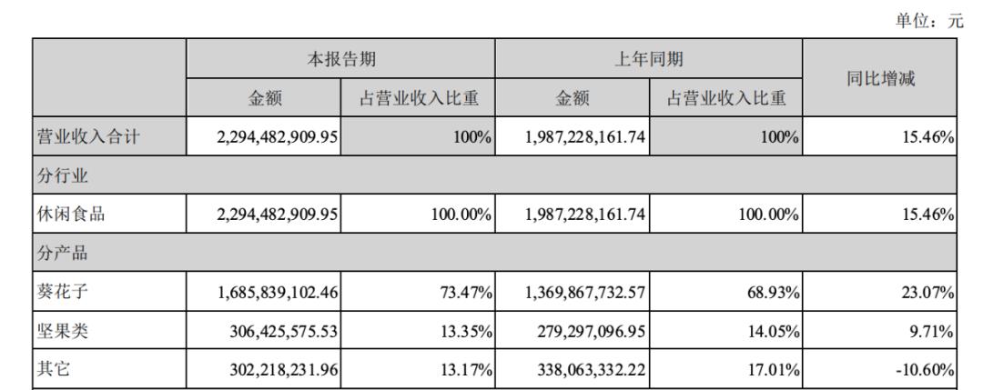 在洽洽食品2020年半年报中,公司主营业务为葵花子类、坚果类和其它产品,其中葵花子产品占总营收的73.47%,营收金额16.86 亿元,坚果类实现收入3.06亿元,占总营收的13.35%,其它类产品实现收入3.02亿元,占总营收的13.17%。和上年同期相比,葵花子类产品营收占比增幅23.07%,而坚果类产品营收占比增幅9.71%。