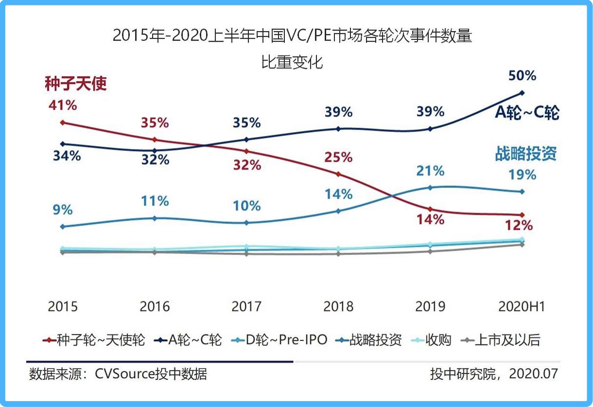 根据上述《报告》,自2015年起,VC/PE机构种子轮和天使轮投资数量占比明显下滑,特别是到了2019年,占年投资事件总数只有14%;相比之下,A轮-C轮投资整体呈上升态势,2020年上半年占比已达50%;而收购、上市及以后阶段投资事件占比曲线斜率较此前也在扩大。