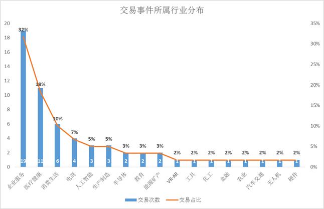 在赛道分布看,本周Top 3热门融资赛道分别为:企业服务(19笔,占比32%)、医疗健康(11笔,占比18%)、消费生活(6笔,占比10%)。企业服务行业独占19笔,持续获得资本青睐。