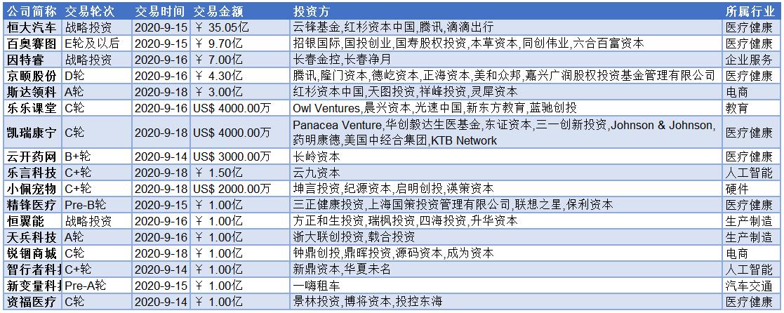 编者按:本周创投热度较上周有所回落,以战略投资和A轮为主,企业服务与医疗健康继续领跑。此外,阿里巴巴于9月16日正式推出“犀牛智造”,其号称“全球首个新制造平台”。该平台以服装产业为切入点,是专门服务于中小企业的数字化智能制造平台,目的在于实现定制服装的批量化生产;TikTok近期将开启一轮Pre-IPO融资,甲骨文和沃尔玛将在此轮融资共计投资近1000亿元 (约125亿美元)。该轮融资完成后,TikTok的投后估值将达到近5000亿元(约625亿美元)。