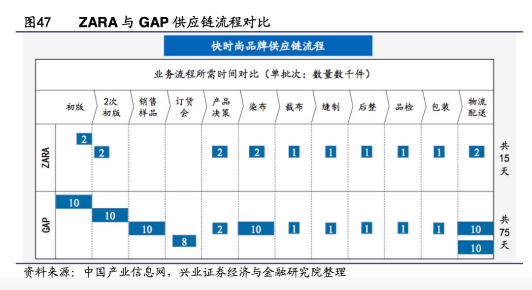 快反供应链的优秀代表是Zara。据和君咨询统计,Zara每年会推出12000个款式,保持一周两次上新的频率,产品从设计到上架的时间不超过3周;同时,Zara利用小批量、多批次的供货方式,每周两次向各地专卖店进行新品配送。快反供应链之下,库存积压问题得到缓解,Zara打折产品只占总量10%左右。