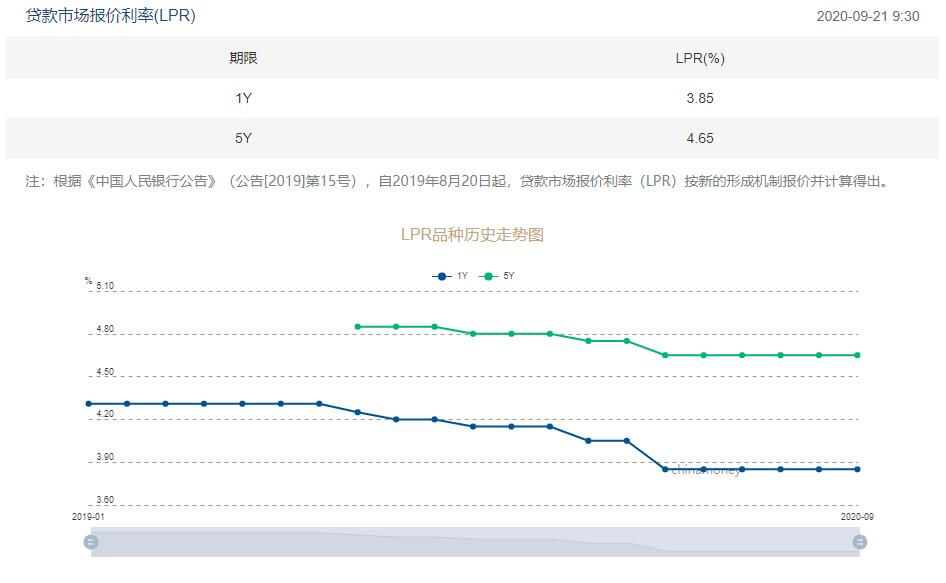 9月21日,央行发布中国9月1年期贷款市场报价利率(LPR)为3.85%,上月为3.85%。5年期贷款市场报价利率(LPR)为4.65%,上月为4.65%。