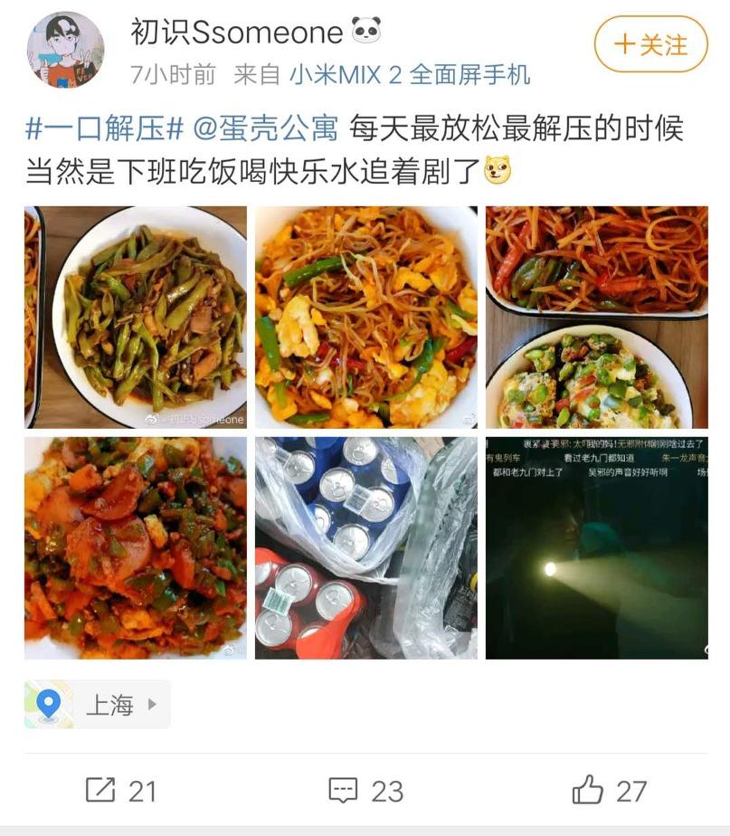 “每天最放松最解压的当然是下班吃饭喝快乐水追着剧啦!”这是参与“一口解压”主题PK赛中,一位名叫“初识someone”的网友在微博上晒出一组美食照。