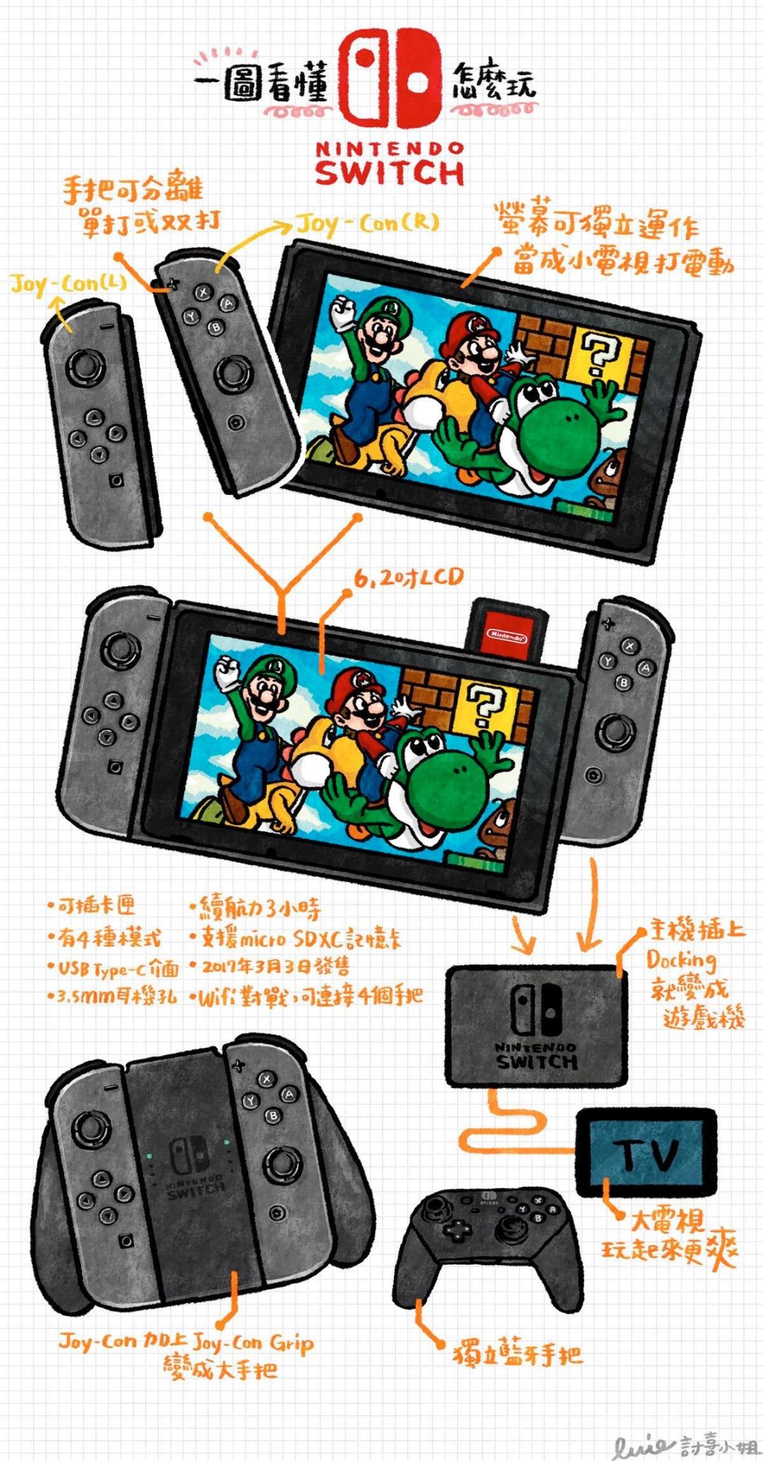 即便在家用机形态下,Switch 仍然体积小巧,秉承的是 Famicom 红白机的「母亲至上」,让妈妈在家打扫的时候不会感到困扰;掌机形态下,体积比手机大比平板小,能让玩家轻松放进包里;6.2 寸的触控屏则让老玩家重温 21 世纪初 DS 掌机游戏机的经典;可拆卸的 Joy-Con 游戏手柄带有重力体感功能,则再现了 Wii 系列的互动娱乐性。