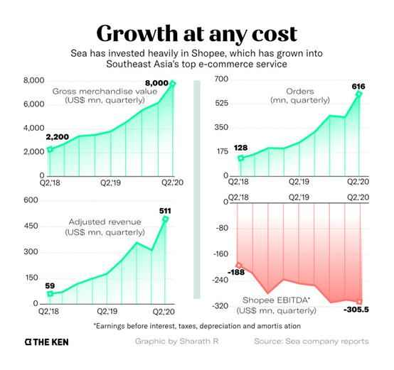 过去一年,Sea成功地将Shopee每单的EBITDA亏损减半至0.5美元,它还声称在中国台湾实现了盈利。但实际情况是,它正在Lazada肉搏,后者背后站着巨头阿里巴巴,它已经在四年内为Lazada投入40亿美元。这意味着,Shopee与Lazada的资本战还未收场。