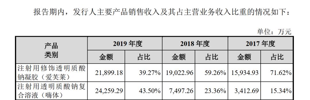 但爱美客跟昊海生科、华熙生物两家公司有所不同,99%以上的收入都要依靠卖玻尿酸产品。爱美客主营的6款产品中,目前只有两款产品能够担当营收的支柱—— "爱芙莱"和"嗨体"。二者合计的营收占比,从2017年至2019年,一直维持在80%以上。