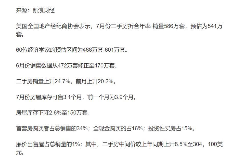 据新浪财经报道,美国7月份二手房成交量折合年化586万套。