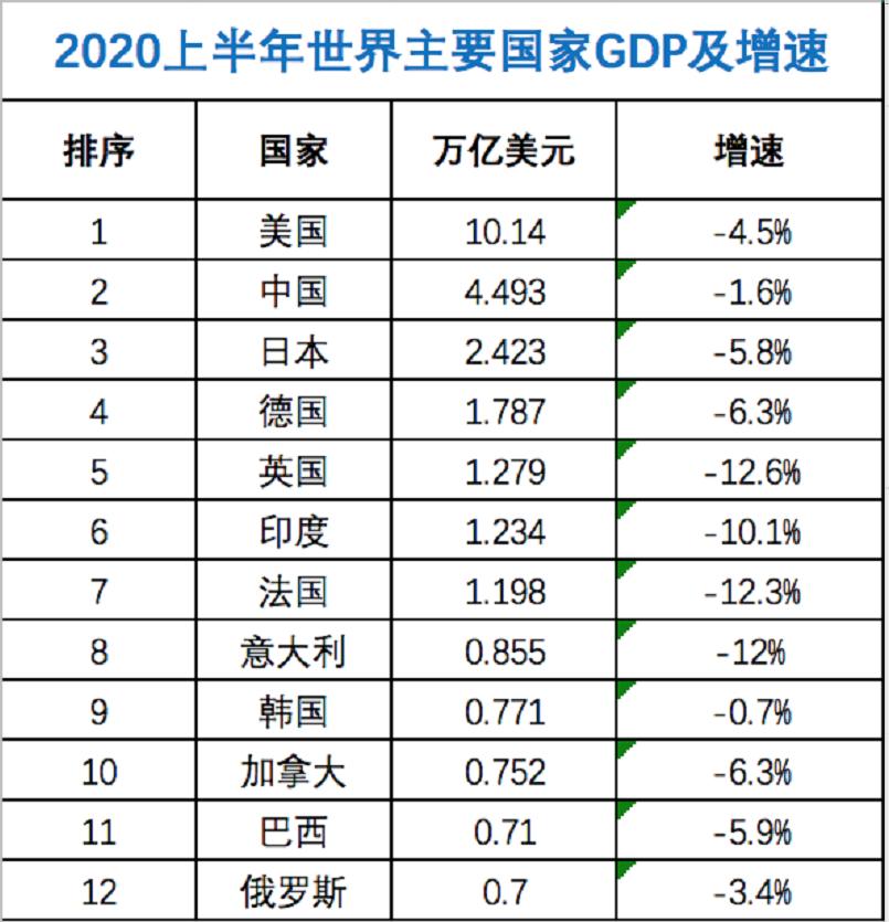 今年上半年,受疫情影响,世界排名前12位的国家GDP无一例外增速都是下跌,这是近100年都没有出现过的情况。