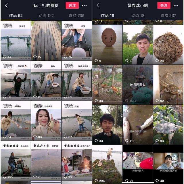 “蟹农沈小明”、“玩手机的费费”则是以“蟹二代”们的视角,将父辈的工作日常用短视频和直播呈现出来。