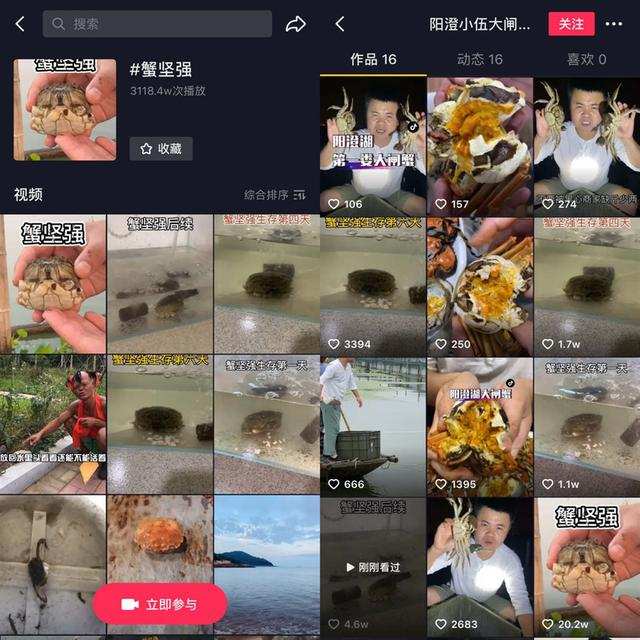 抖音上的“阳澄小伍大闸蟹”就用“连载”的方式来吸引粉丝。9月初,他号称捡到了一只“蟹坚强”,“所有腿都被水鸟给吃了”。他把“蟹坚强”带回家养在水缸里,每天发布短视频更新“蟹坚强”的最新动态。截至9月21日,抖音“蟹坚强”话题累计播放量已经超过3000万次。
