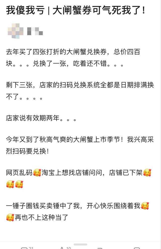 前不久就有网友在豆瓣控诉,去年买的4张大闸蟹券,只换了1张,因为店家日期排满无法预约兑换。好在券的有效期是2年,今年兴高采烈想要兑换时,却发现店铺已经下架。