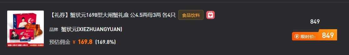 “公4.5两母3两 各4只”的蟹状元大闸蟹礼券,原价1698元,直播间售价849元,“仅”用一半价格,就可以把真正的阳澄湖大闸蟹带回家。