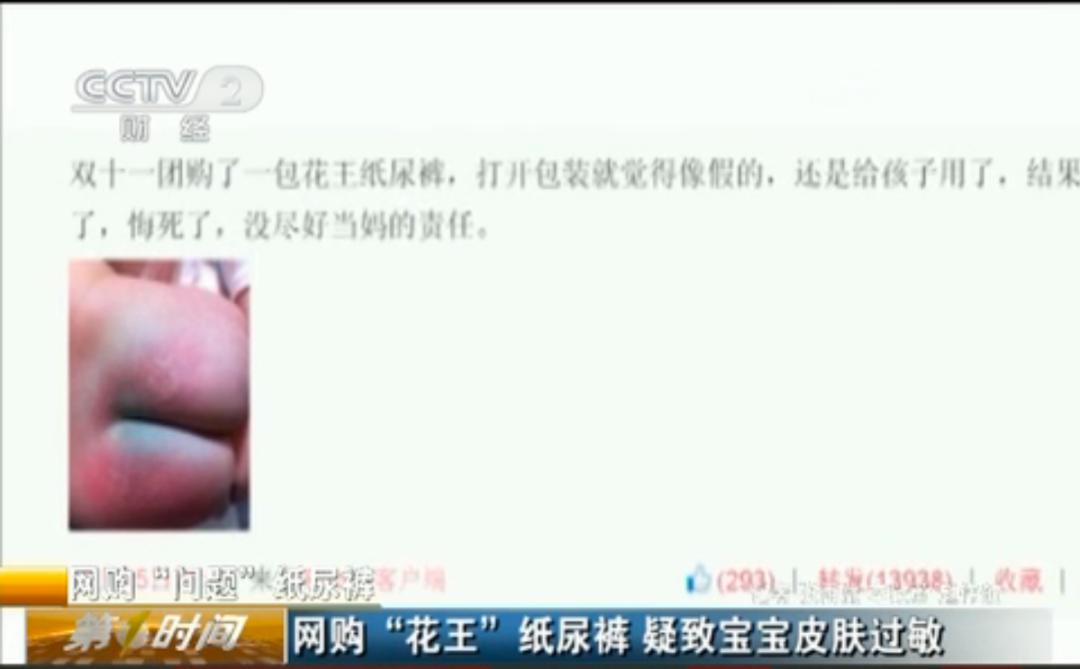 央视新闻曾报道家长购买疑似假货的“花王”纸尿裤,导致宝宝皮肤过敏/央视网