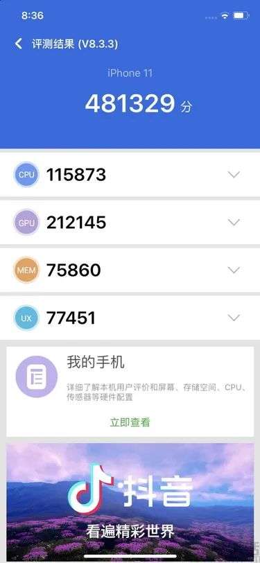 性能方面,实测安兔兔跑分高达48万分,综合来看比iPhone XR提升了接近20%。