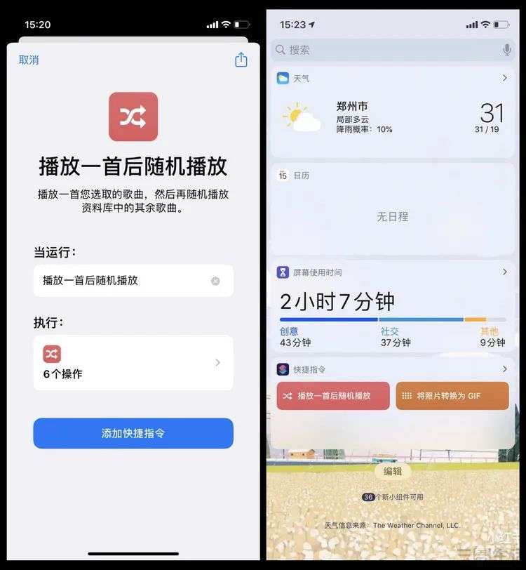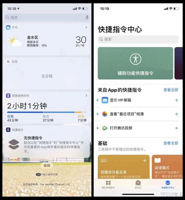除了CarPlay外,另一个给我很大惊喜的就是捷径功能,负一屏上默认有快捷指令界面,点击即可打开捷径中心。