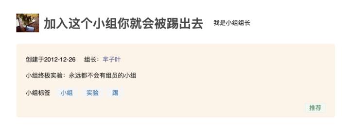 2012 年末,一个奇奇怪怪的「加入这个小组你就会被踢出去」创立了。在人来人往的豆瓣,这个小组只是几十万个小组中普通的一个,但因为小组主题不走寻常路,这个小组迅速火爆,一切都有点出乎意料。