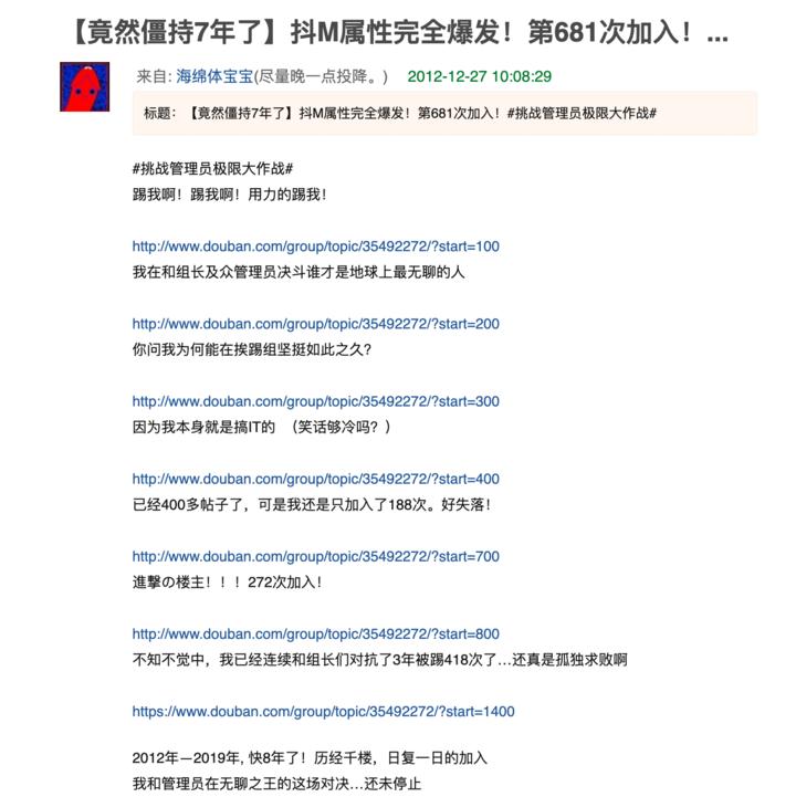 还有自称「抖 M 属性完全爆发」的豆友 @海绵体宝宝 也在坚持着。他在小组创立的第二天加入,至今已经被踢了 681 次,他熟悉小组的管理员增减情况,对这个游戏乐此不疲: