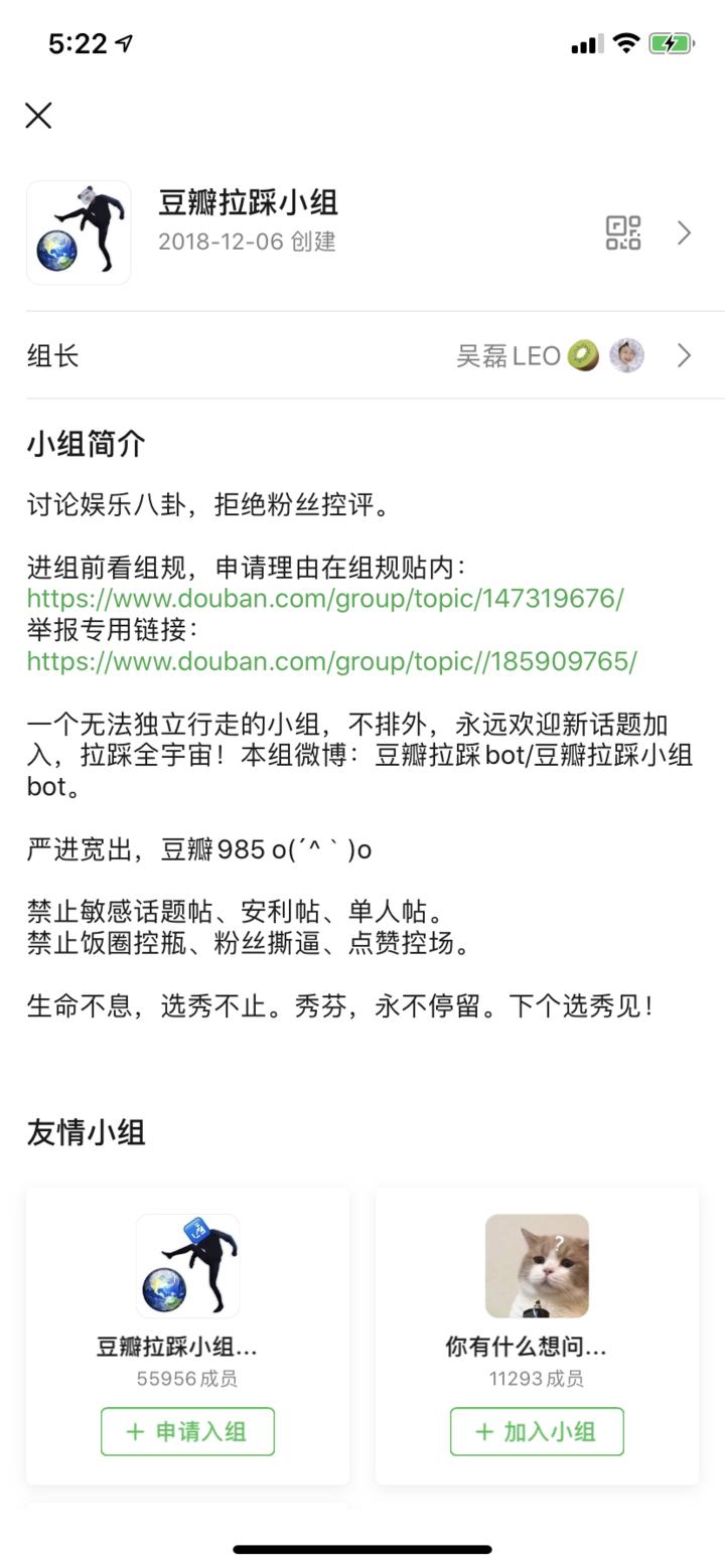 但也有人不喜欢豆瓣小组。创立了「加入这个小组你就会被踢出去」的 @芈子叶 就表示他大概 2014 年左右就不逛小组了,他加入的小组有不少也沉寂了。在他看来,小组是一种过时的通讯方式:「微信群是即时的,但豆瓣小组基本不可能让你获得即时的信息。」