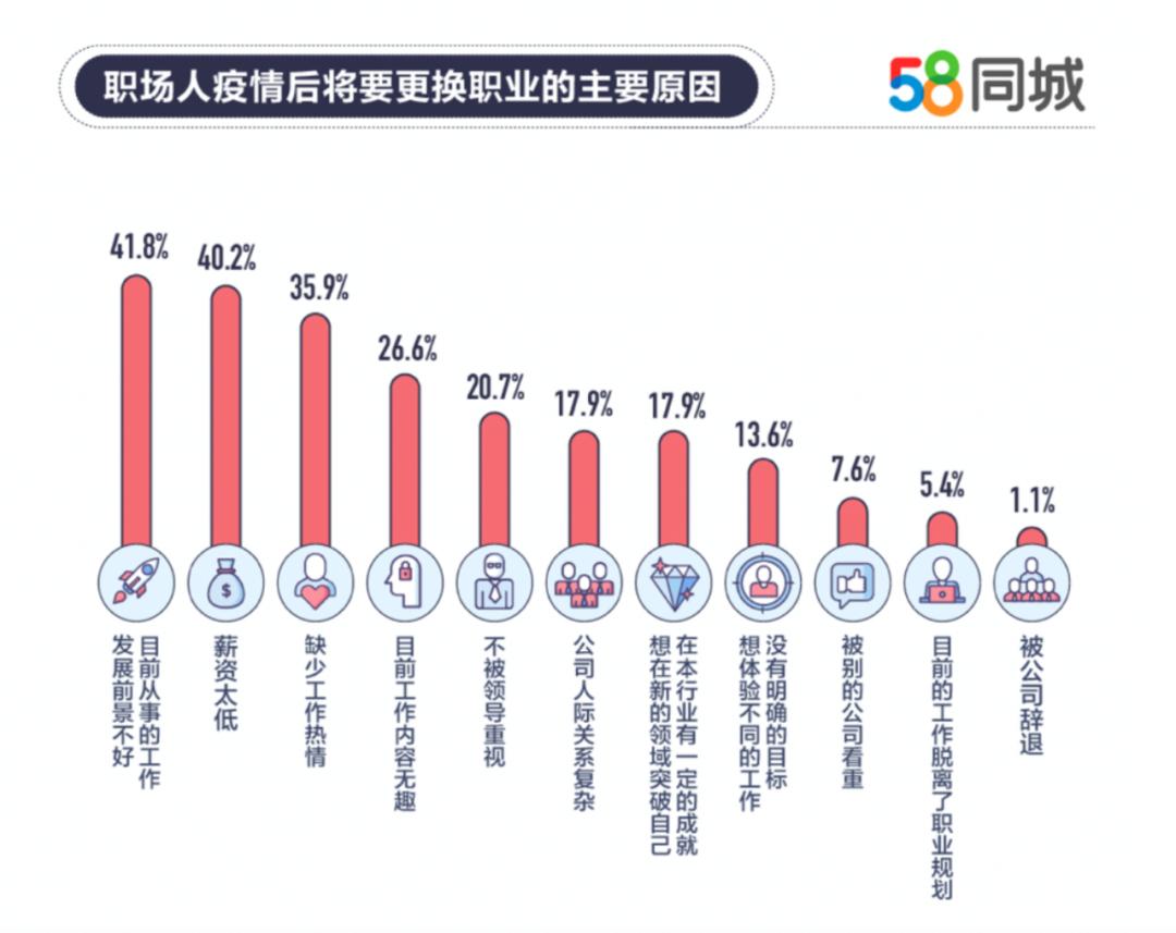 58同城发布的《2020年就业趋势调研报告》中指出33.8%的职场人工作在疫情后将会调整,其中超过40%的人是因为认为目前从事的工作发展前景不好。