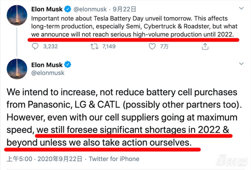 马斯克在电池日之前就在推特上表示,预计要到2022年才能量产新一代电芯,并且这个电芯将主要用于Semi卡车、火星皮卡和新一代的Roadster跑车。