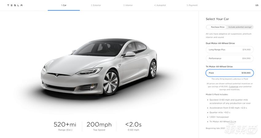 在特斯拉中国官网,Model S Plaid车型的续航预估值为840公里以上,最高时速为320km/h,百公里加速小于2.1秒,售价为117.49万元,交付时间预计在2021年末。