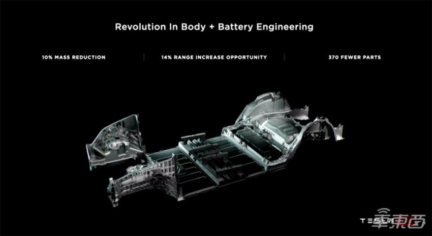 这个技术首先是要用先进的一体冲压技术来做出车身,然后再将电芯装入车辆中部。特斯拉表示,这种装配工艺在保持容量不变的情况下,能够省掉370个车身零部件,减轻10%的车身重量,同时还电池更接近车身中心,能够更好平衡车身,提升稳定性。