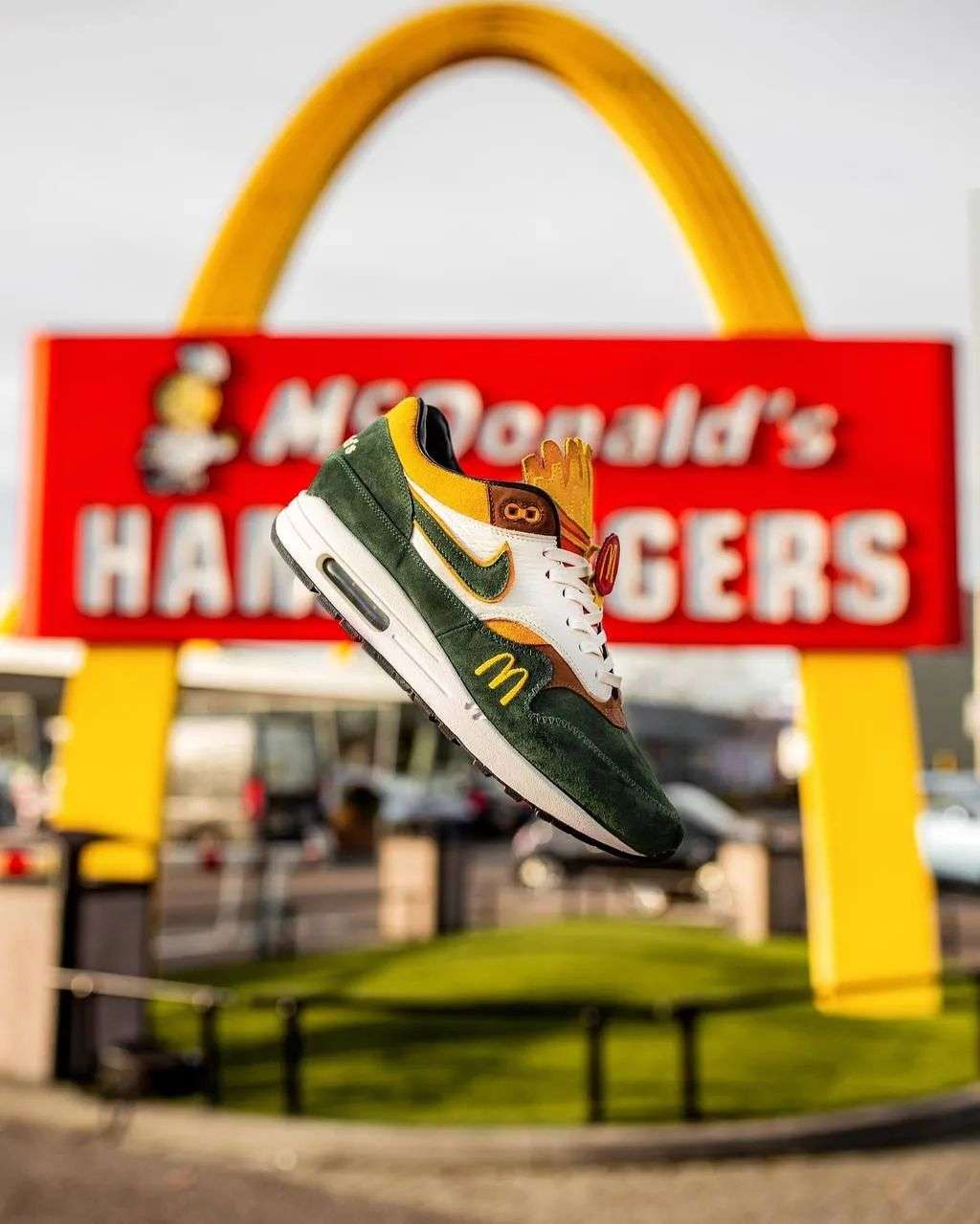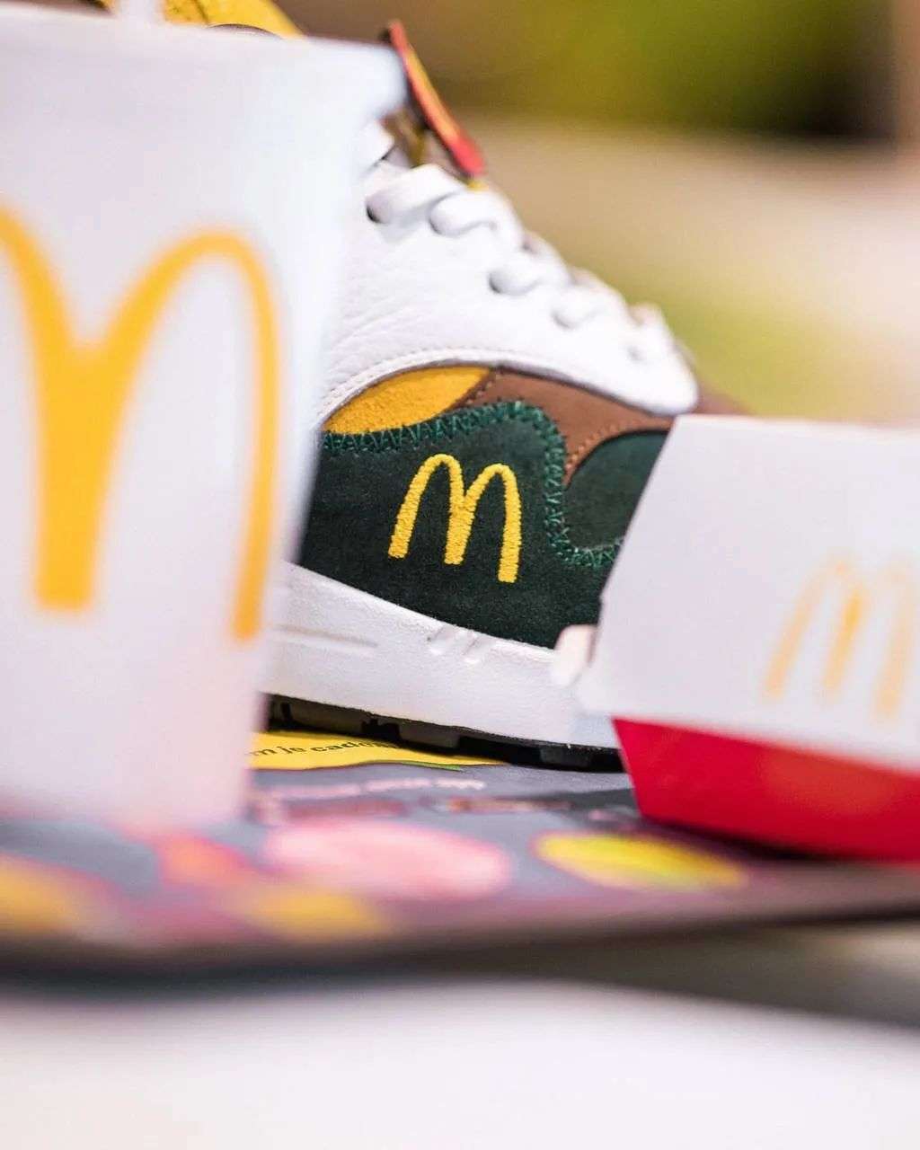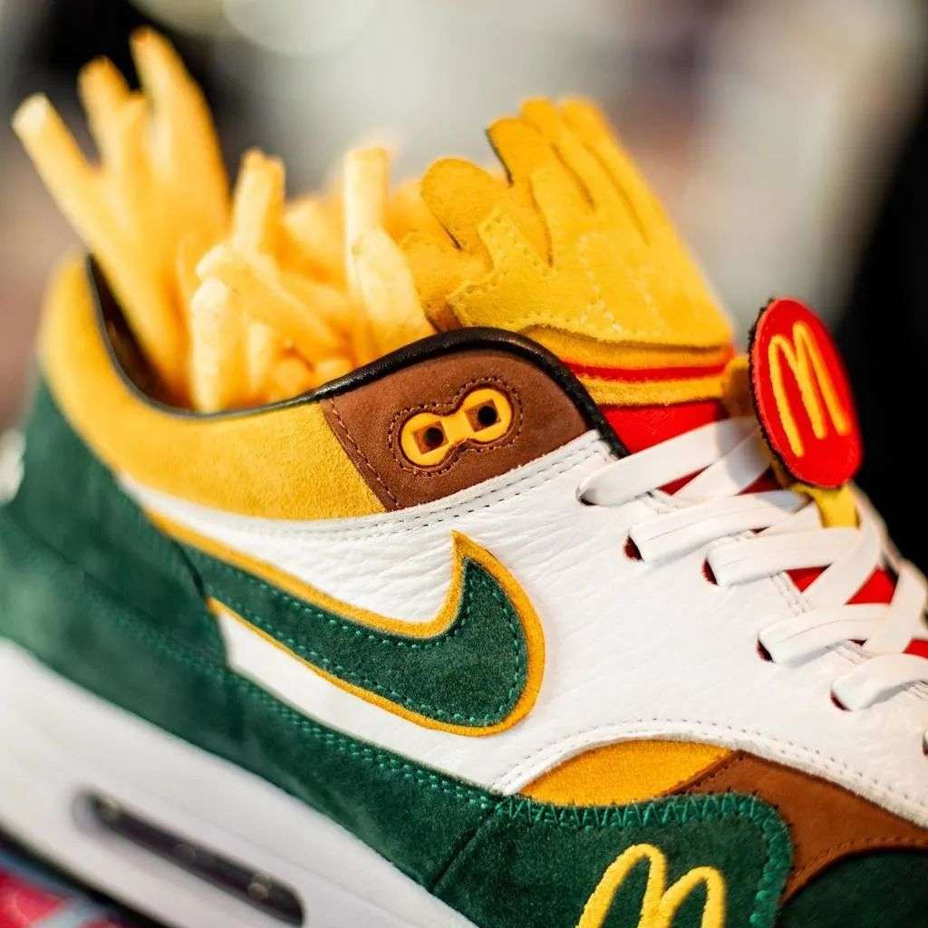 全球仅一对的「麦当劳」配色 air max 1,黄绿主配色,鞋舌处被做成「薯条」轮廓,加上「M」刺绣标。