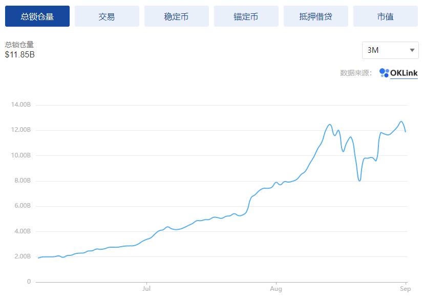 据OKLink数据,DeFi总锁仓量从7月1日的19.59亿美元涨至9月20日的127.18亿美元,增幅近6.5倍。
