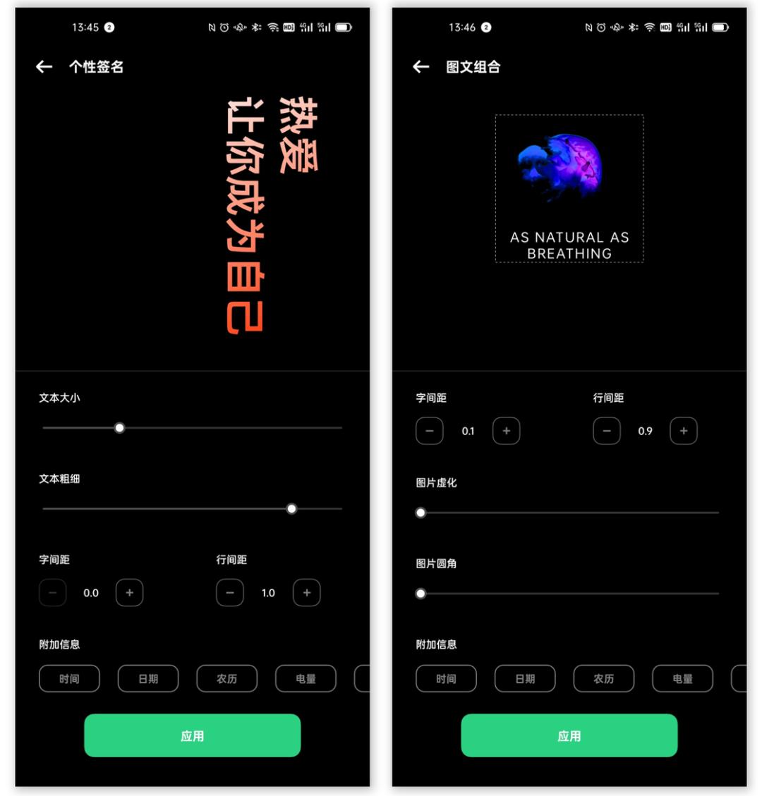 另外,个性签名、图文组合、时钟等息屏样式在 ColorOS 11 中也拥有了更加灵活、丰富的细节设定,不管是文本大小、对齐方式、粗细、字间距还是图片虚化、圆角,都支持根据个人喜好自行微调,电量、通知、农历这类息屏显示内容也可以根据实际情况自行选择开关。